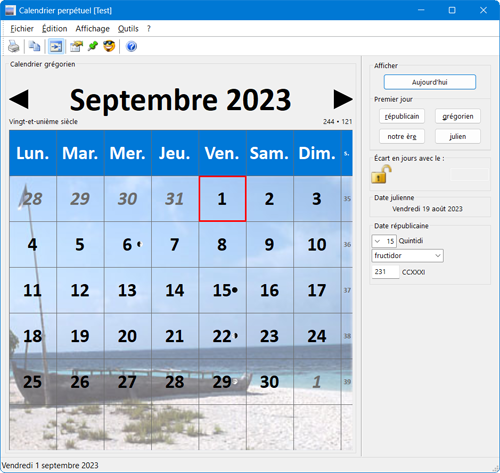 La fenêtre principale du calendrier se compose de deux volets. Le calendrier mensuel à gauche, toujours visible et à droite, un volet rétractable affiche un ensemble d'informations, dont la correspondance julienne et républicaine de la date affichée. Plusieurs boutons permettent de se positionner à la date système (aujourd'hui), au début du calendrier républicain (22 septembre 1792), au début du calendrier Grégorien (par défaut, 15 octobre 1582), au début de notre ère (1er janvier 1), ou au début du calendrier julien (1er janvier de l'an 45 avant notre ère).